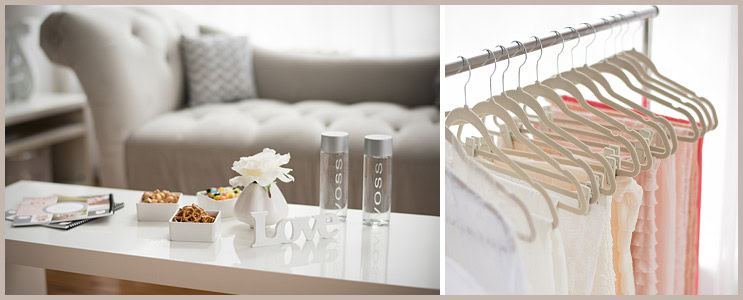 Close-ups of refreshments on top of a coffee table in a maternity portrait studio, alongside a clothing rack with various drapes.